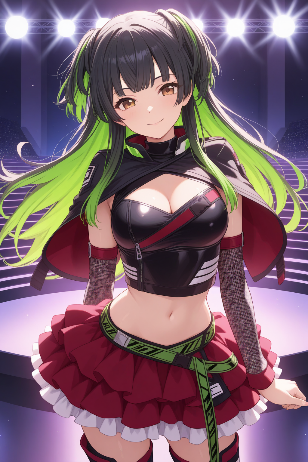 bbfuyuko, 갈색 눈, 다색 머리, 검은 머리, 녹색 머리, 양측 올림, fuyukoidol, 검은 캐프레, 검은 셔츠, 크롭탑, 가슴 부분 절개, 분리형 소매, 긴 소매, 허리 부분, 녹색 벨트, 빨강 치마, 계층적 치마, 프릴이 있는 치마, 허벅지 부츠,