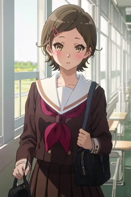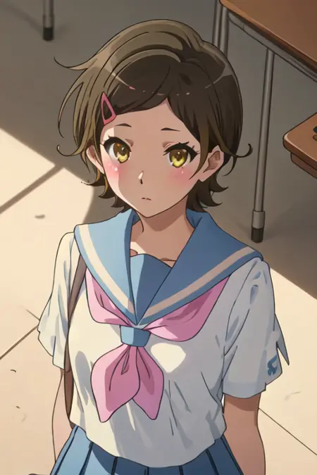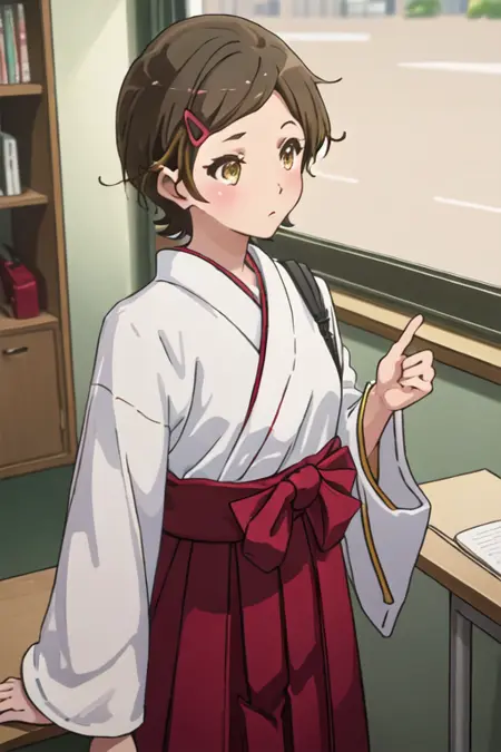 - 축소된 캐릭터 태그는 단발, 갈색 머리, 머리장식, 헤어클립, 갈색 눈, 노란 눈입니다. 캐릭터의 핵심 특징(예: 머리 색상)이 안정적이지 않을 때 이 태그들을 프롬프트에 추가할 수 있습니다.
