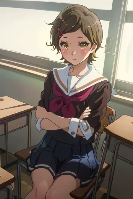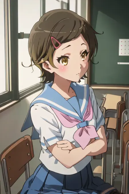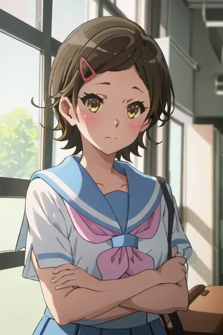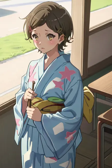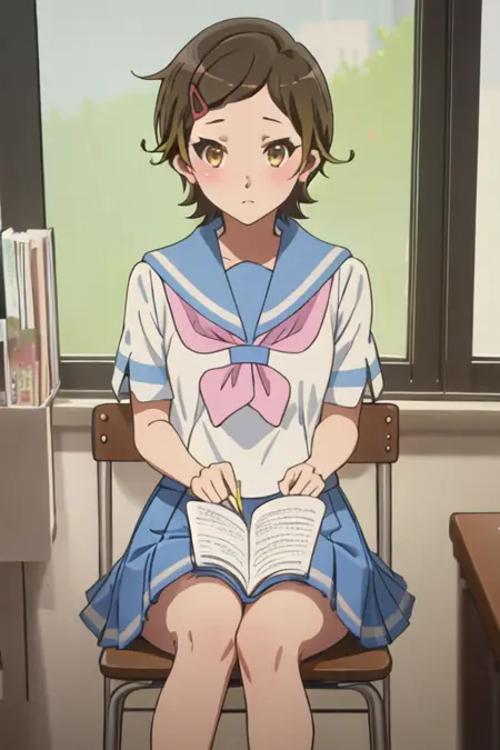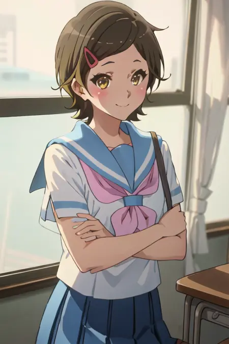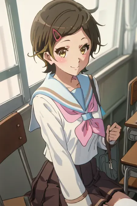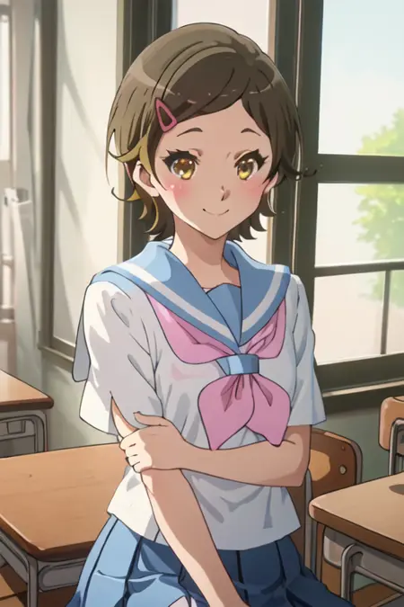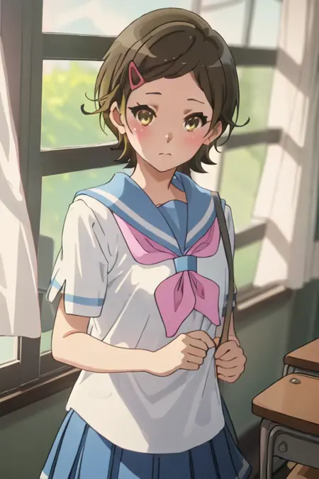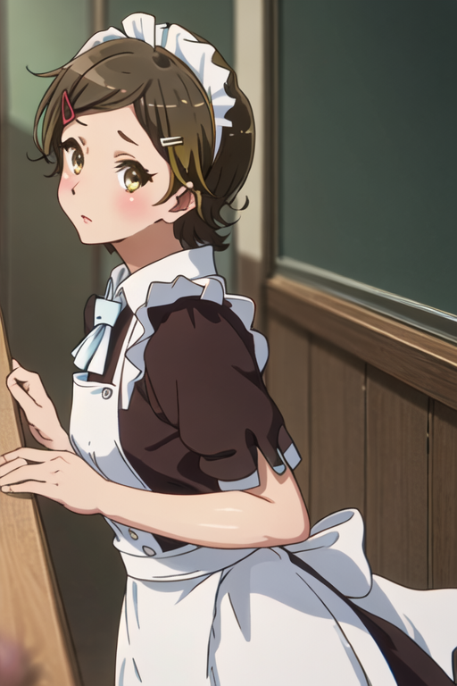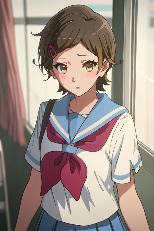 - 축소된 캐릭터 태그는 단발, 갈색 머리, 머리장식, 헤어클립, 갈색 눈, 노란 눈입니다. 캐릭터의 핵심 특징(예: 머리 색상)이 안정적이지 않을 때 이 태그들을 프롬프트에 추가할 수 있습니다.