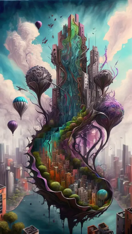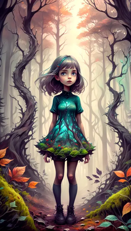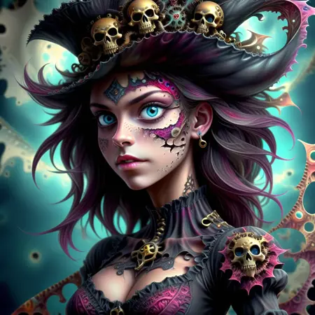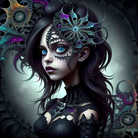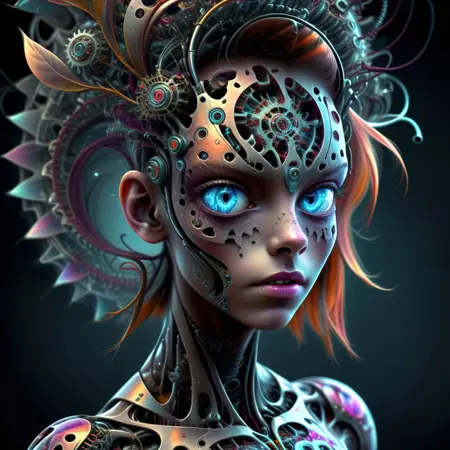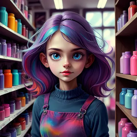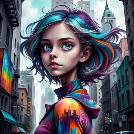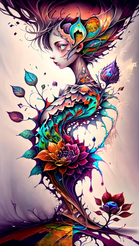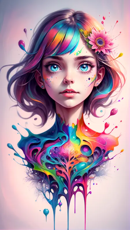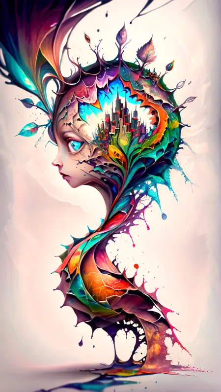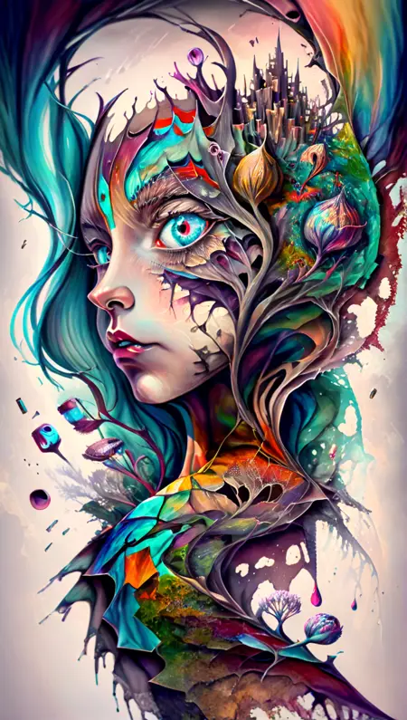 もう一つのモデル、FRACOLOR LoRA XLをプレゼントしたいと思います。このモデルはILLUSIONIXと若干似た動作をしますが、トレーニングに使用した原画が異なるため、明確に異なります。ILLUSIONIXは、私がAIで処理したインク画でトレーニングされています。一方、FRACOLORも私の作品を使用してトレーニングされていますが、今回はアクリル絵画技法で作成されたより色彩豊かなイラストを用い、一部をAIで修正しました。さらに、フラクタルやこぼれた絵の具の要素も取り入れています。その結果、若干予測不可能な挙動を示すものの、魅惑的な効果を生み出すモデルとなりました。