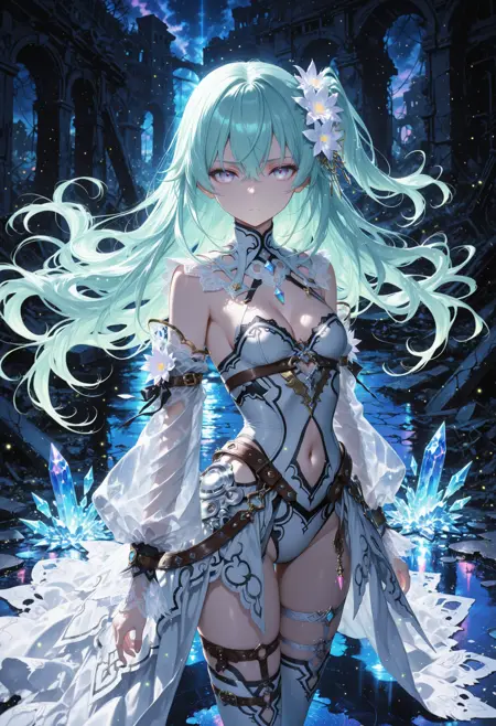 white leotard, cleavage, detached sleeves, see-through sleeves, navel, belt, showgirl skirt, thigh strap, white thighhighs, toeless legwear
