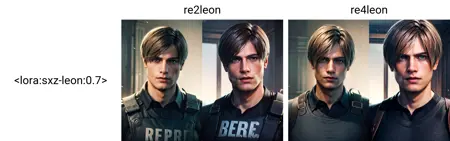 RE2 리메이크 스타일을 원하시면 re2leon을 사용하세요 (짧은 헤어스타일, 더 어두운 색, 젊은 느낌), RE4 리메이크의 더 성숙한 느낌을 원하시면 re4leon을 사용하세요 (긴 머리, 밝은 색상, 성숙하고 진지하며 무거운 감성).
