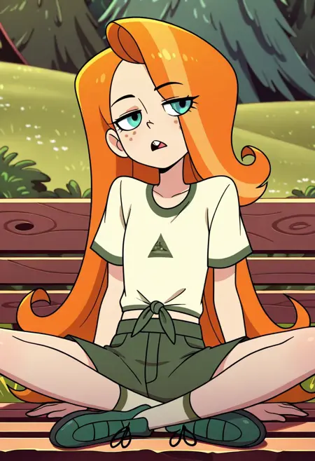 carla, 1girl, solo, long hair, orange hair, aqua eyes, freckles, buck teeth, camp uniform, tied shirt, beige shirt, midriff, green shorts, socks, green shoes,
