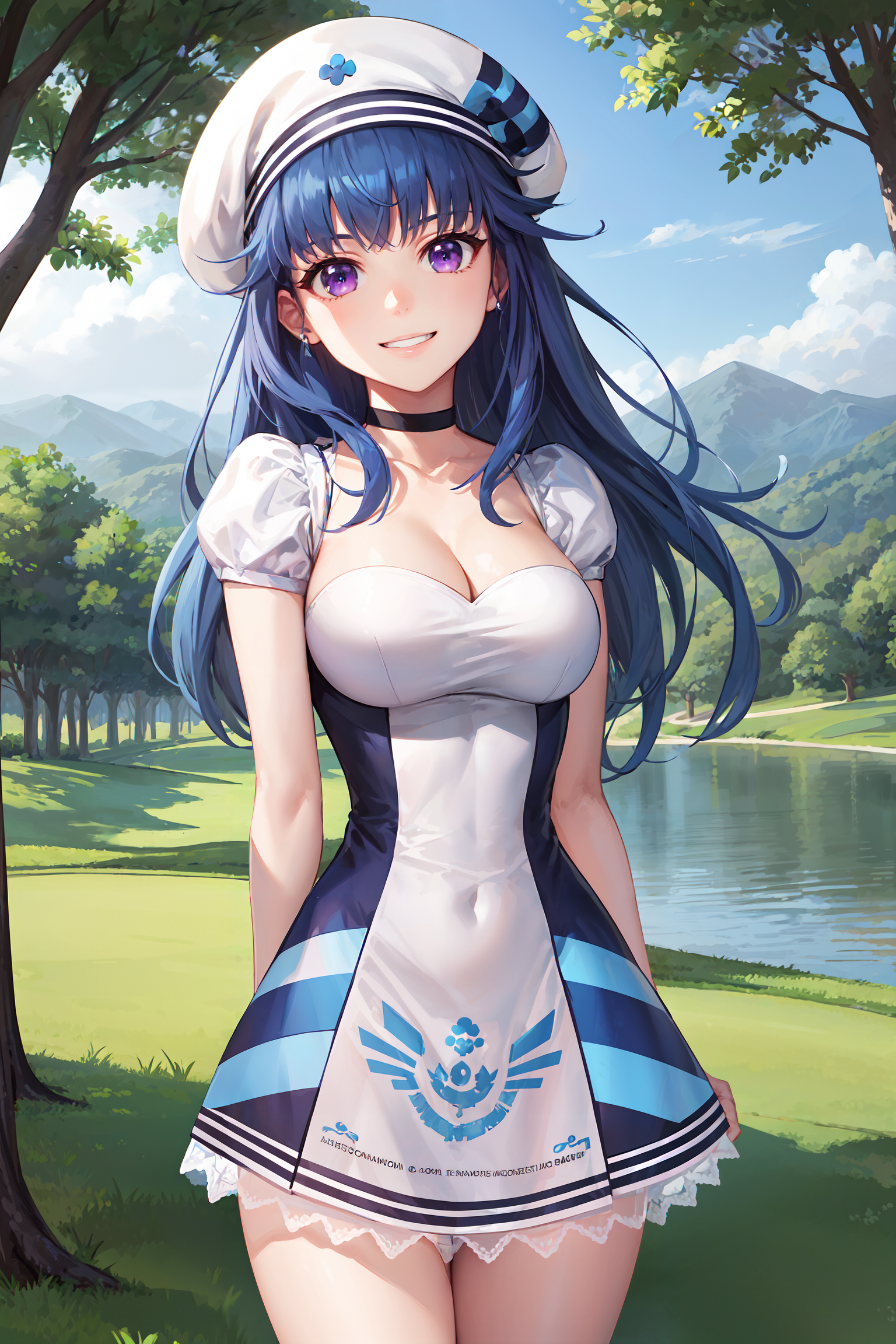 beret, choker, dress, cleavage, knee boots