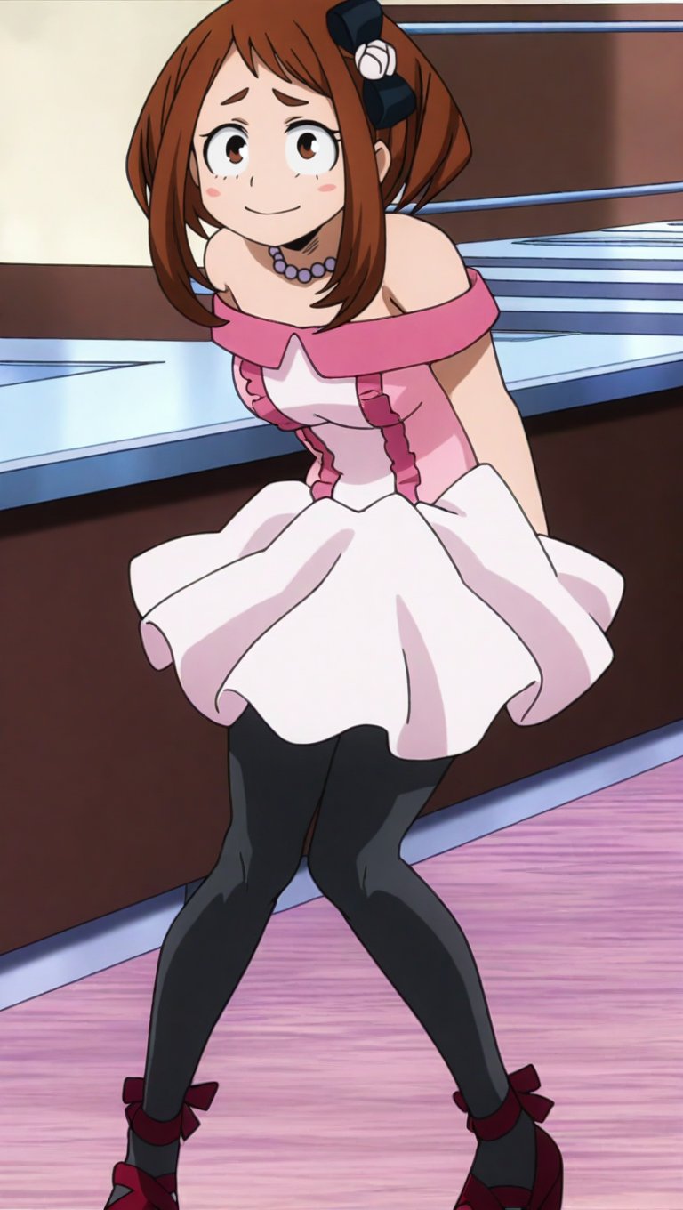 双英雄服装,粉色连衣裙,露肩,露肩连衣裙,发饰,蝴蝶结,珠宝,珍珠项链,黑色丝袜,红色高跟鞋,