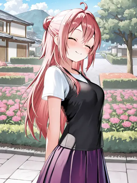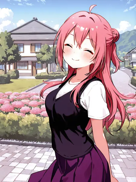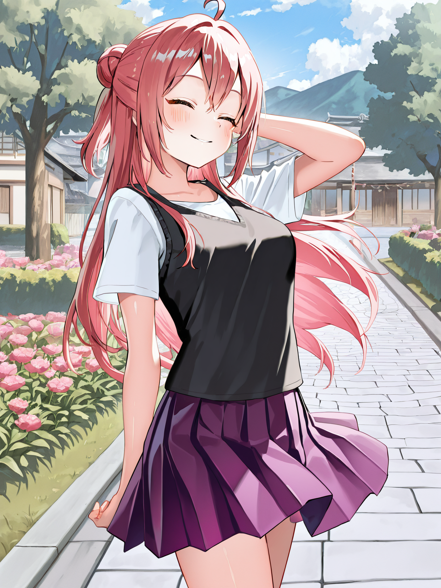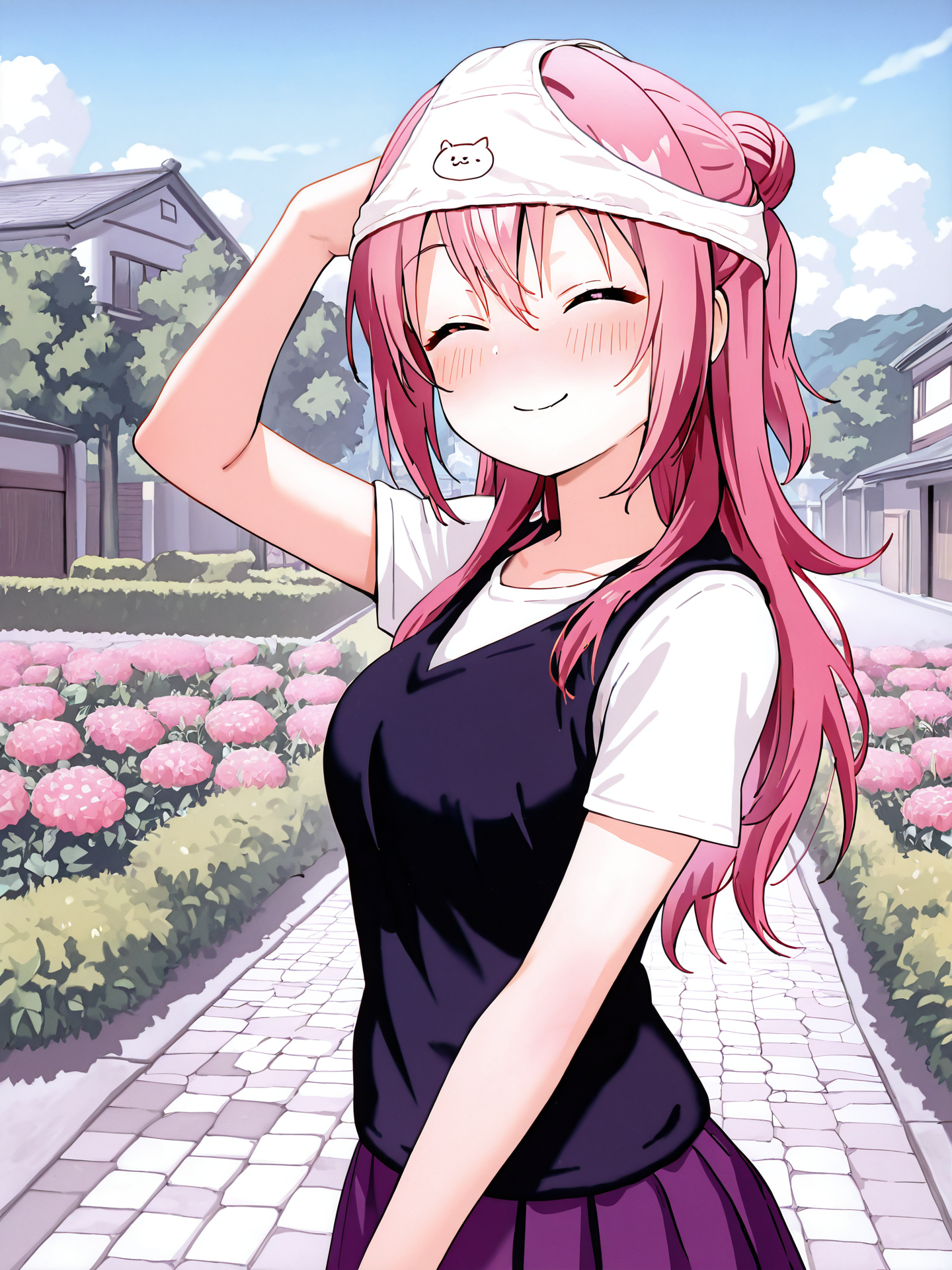 기본:akazaakane, 눈 감음, 분홍색 머리카락, 긴 머리카락, ahoge, 눈 사이의 머리카락, 단일 머리 뭉치