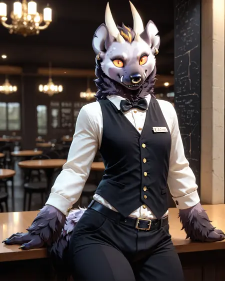 demon, hyena, damian, horns, piercing nose, colored sclera,