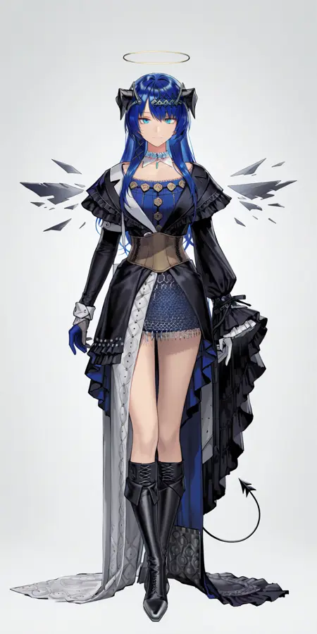 hair ornament,asymmetrical dress, brown corset, layered dress,frilled sleeves, choker, asymmetrical gloves,knee boots,