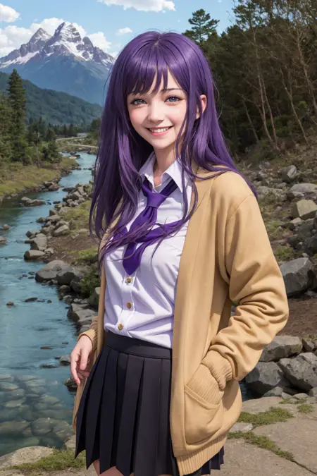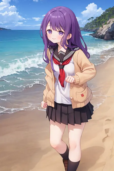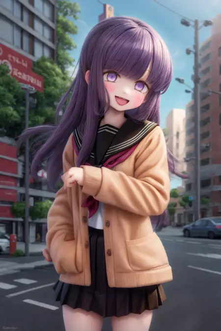 使用 kubonagisa 召唤她,使用 紫色眼睛、紫色头发、长发、刘海 构建她的头部;要获得默认校服,添加 校服、开衫、黑色短裙、红色领巾;否则……你可以自由发挥服装设计,这个风格相当灵活。