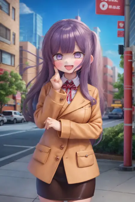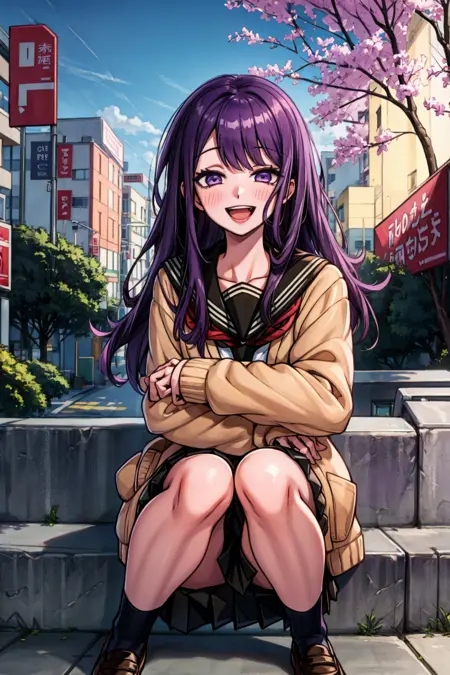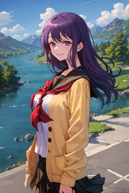 그녀를 소환하려면 **kubonagisa**를 사용하고, 머리를 형성하려면 **보라색 눈, 보라색 머리카락, 긴 머리, 앞머리**를 사용하세요. 기본 학교 복장을 얻으려면 **학교 복장, 카디건, 검은 스커트, 빨간 세라후쿠**를 추가하세요. 그렇지 않으면... 옷을 자유롭게 꾸밀 수 있으며, 이 설정은 상당히 유연합니다.