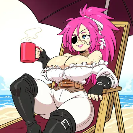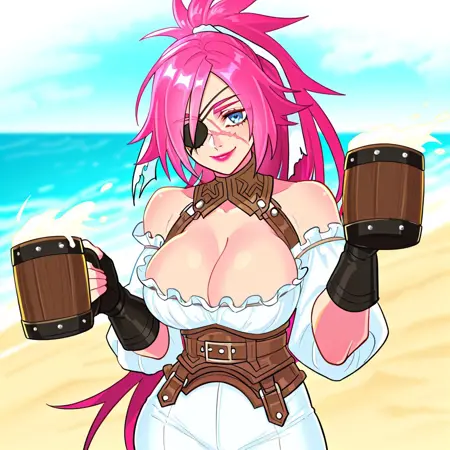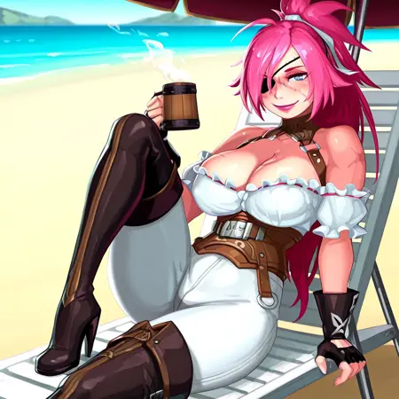 アウトフィット2用その他のタグ:アイパッチ、傷、青い目、裸の肩、裂けた髪リボン、レースの白いシャツ、白いシャツ、胸元、大きな胸、ポニーテール、ピンクの髪、ベルト、指なし黒手袋、白いパンツ、ももぶき、ハイヒール