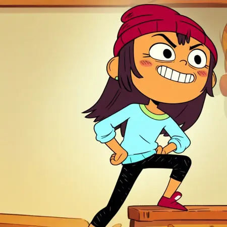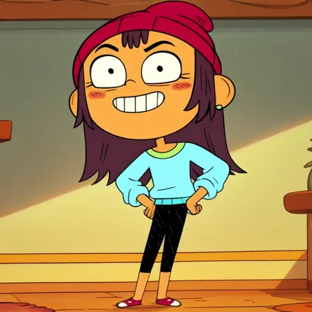 chibi, lily pak, wylde pak, 红色帽子, 长发, 深棕色头发, 黑色眼睛, 脸颊贴纸, 上排牙齿, 缺牙, 脸颊贴纸, 黑色裤子, 袜子, 红色鞋子,