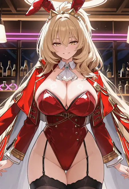 zylionog, 1girl, wearing aylion uniform, animal ears, lion ears, solo, long hair, large breasts, bangs, blonde hair, hair ornament, thighhighs, long sleeves,cleavage, jacket, yellow eyes, ponytail, thighs, parted lips, black thighhighs, leotard, ascot, highleg, garter straps, red jacket, highleg leotard, epaulettes,