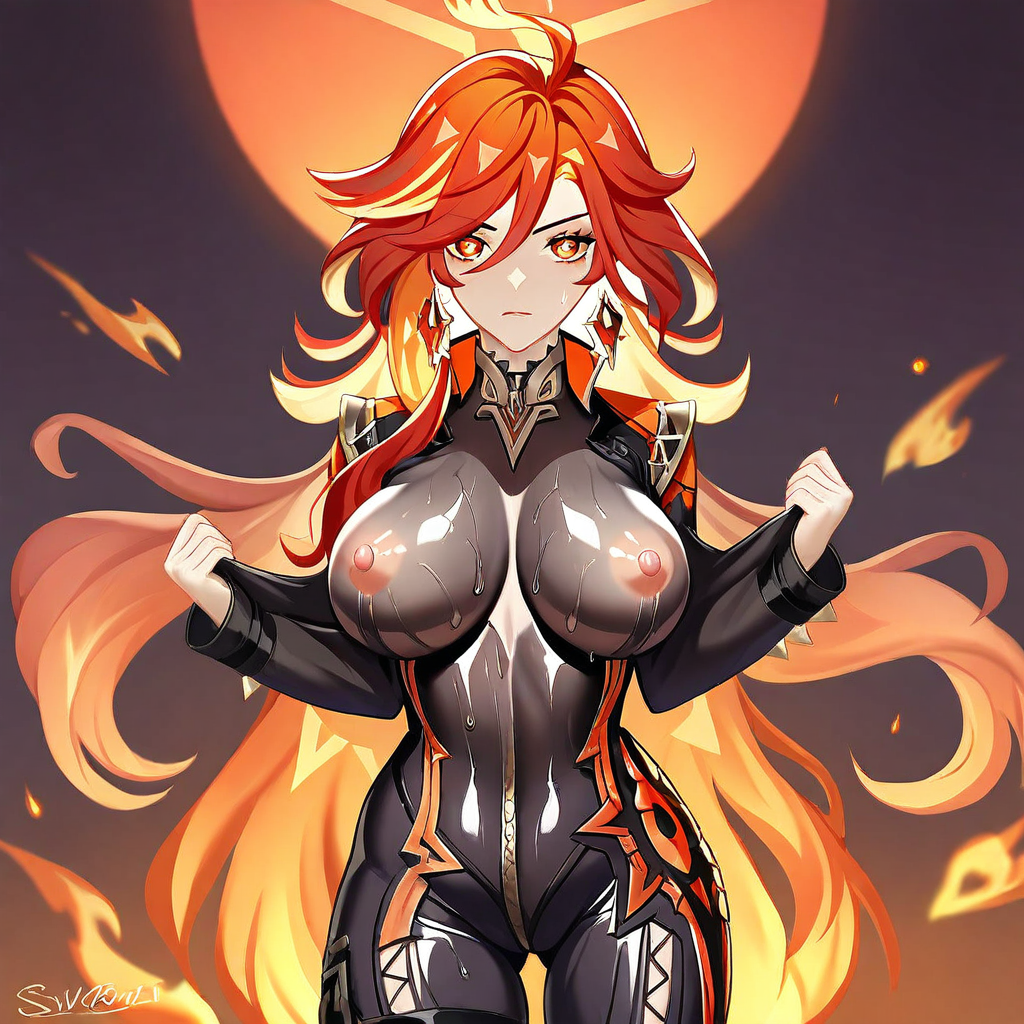 (Genshin_Mavuika, 橙色眼睛, 太阳形状的瞳孔, 橙色头发, 红色头发, 长发, 多色头发, 染发, 天线辫, 火焰, 火, 连体衣, 夹克)