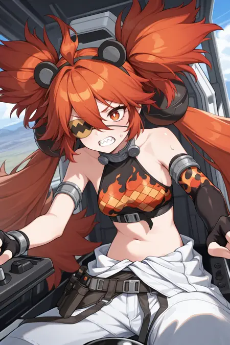 복장: 금속 목걸이, 어깨 노출, 팔찌, 검은 크롭탑, 불꽃 무늬, 유방 아래, 높은 벨트, 검은 벨트, 허리 주변의 흰색 자켓, 도구 벨트, 벨트 주머니, 넓은 바지, 흰색 바지, 검은 양말, 검은 신발, 한쪽 장갑, 한쪽 팔꿈치 장갑, 손가락 없는 장갑, 검은 장갑