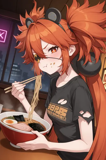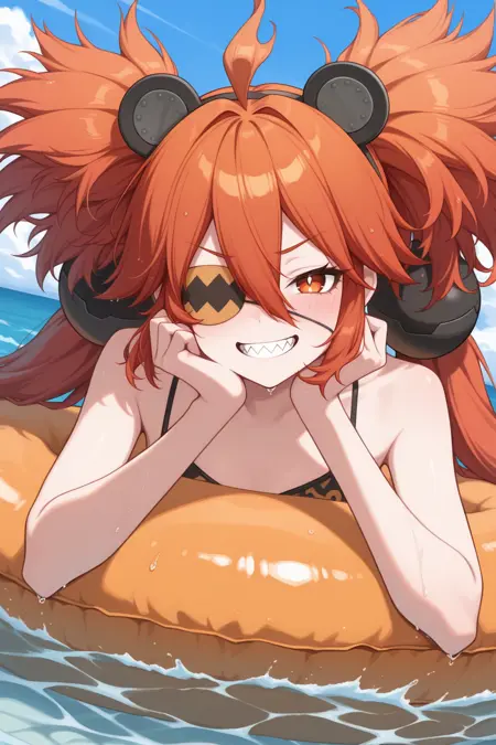 외모: bel0b0g, 날카로운 이빨, 작은 가슴, 주황색 눈, 흰색 동공, 주황색 머리카락, ahoge, 눈 사이의 머리카락, 옆머리, 매우 긴 머리카락, 네 개의 꼬리, 머리카락 공, 색깔 있는 안대, 프린트 안대, 동물 귀 헤어밴드, 검은 헤어밴드, 옆머리, 눈 사이의 머리카락