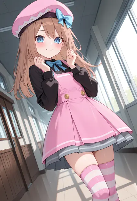• nramaca, 发饰蝴蝶结, 蓝色蝴蝶结, 贝雷帽, 粉色头饰, 粉色连衣裙, 围裙裙, 黑色衬衫, 长袖, 条纹大腿袜, 灰色裙子, 裙下裙,
