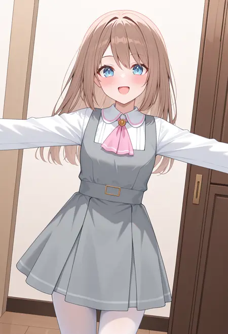 • nram2df, 白色衬衫, 带领子衬衫, 粉色领结, 围裙裙, 灰色连衣裙, 长袖, 白色丝袜,