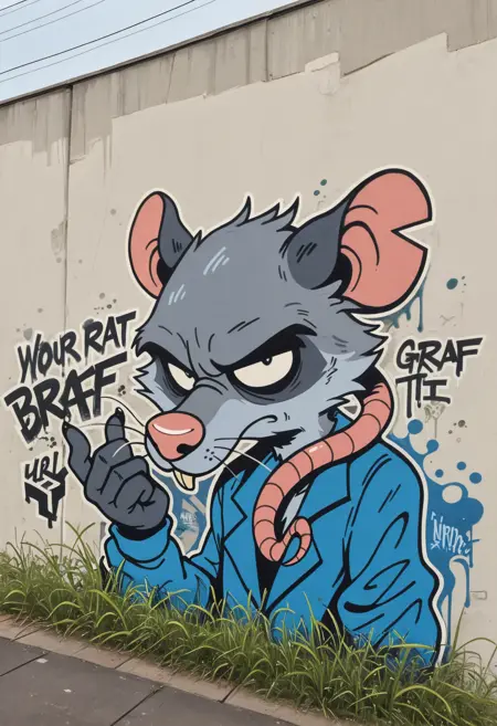 📝Яркий мультяшный концепт, вдохновлённый уличным граффити и городским визуальным стилем. Эта LoRA передаёт дерзость, выразительность и уличную энергию антропоморфных персонажей, словно нарисованных прямо на бетонной стене. Жирные контуры, хищные эмоции и дух свободы.