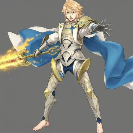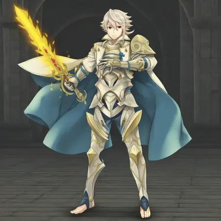 malecorrin, white hair, hair between eyes, pointy ears, red eyes, blue cape, armor, metal gloves, toeless legwear, barefoot, stirrup legwear