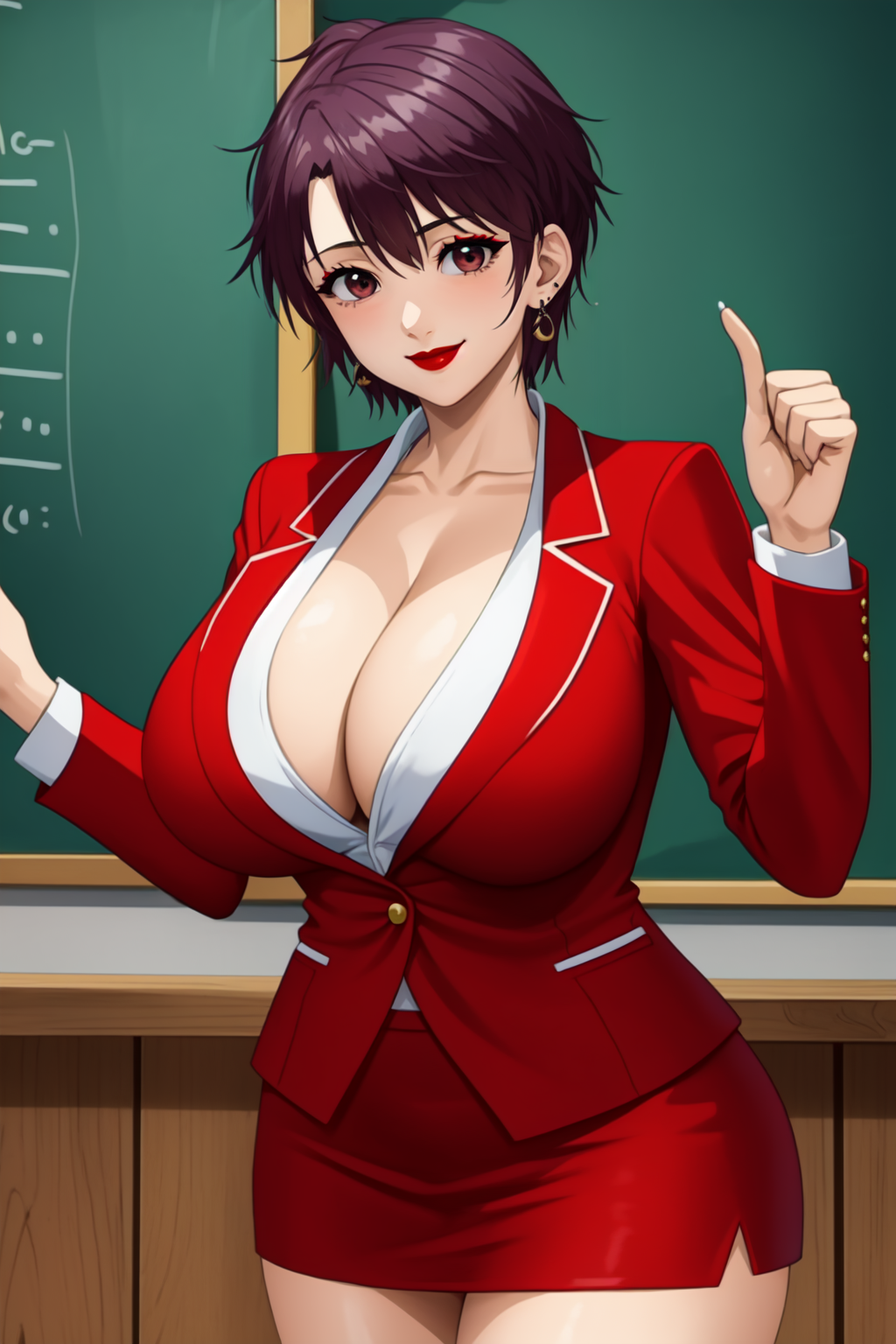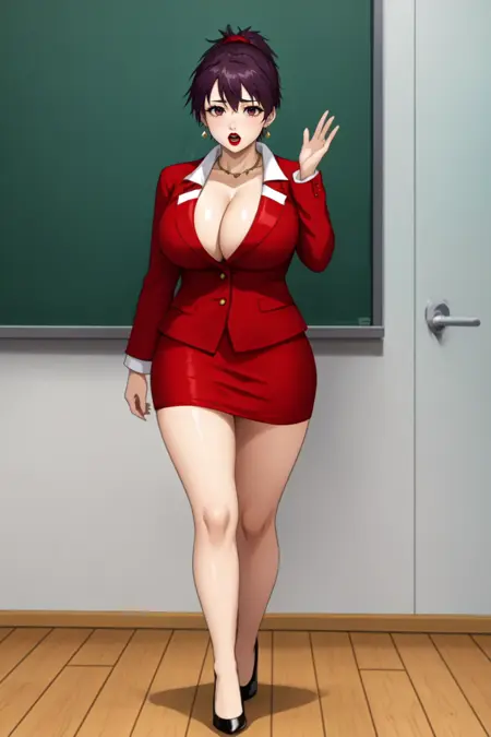 红色西装外套, 有领衬衫, 红色短裙, 超短裙, 带铆钉腰带, 暴露胸脯
