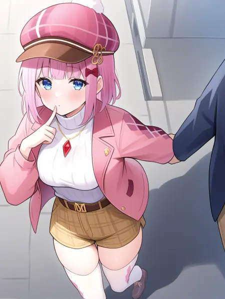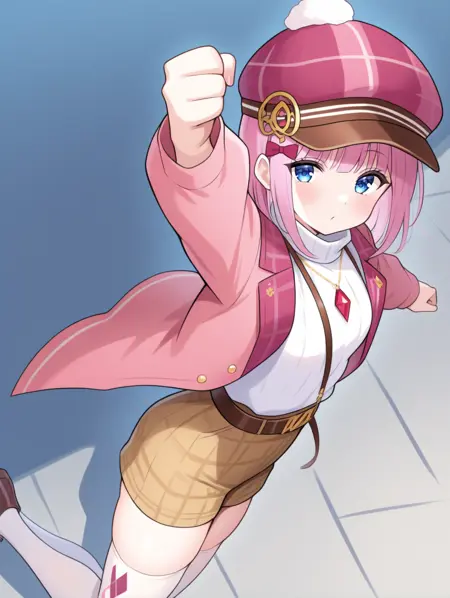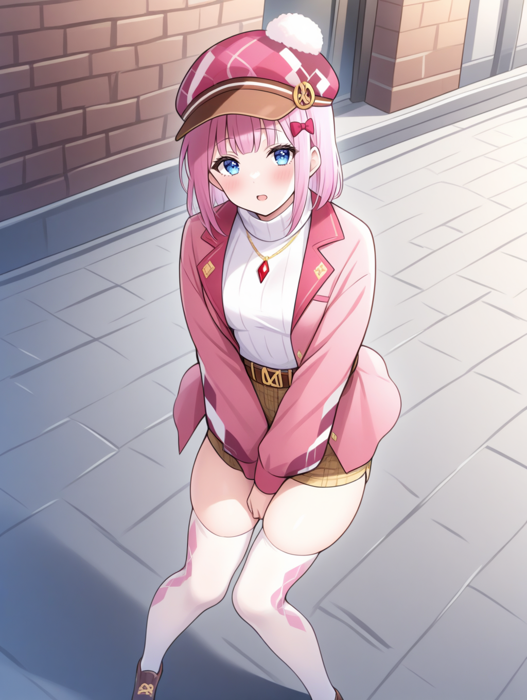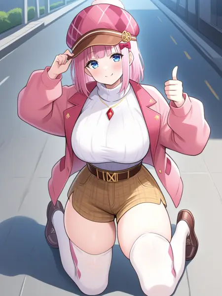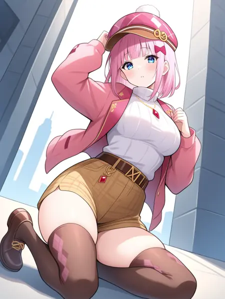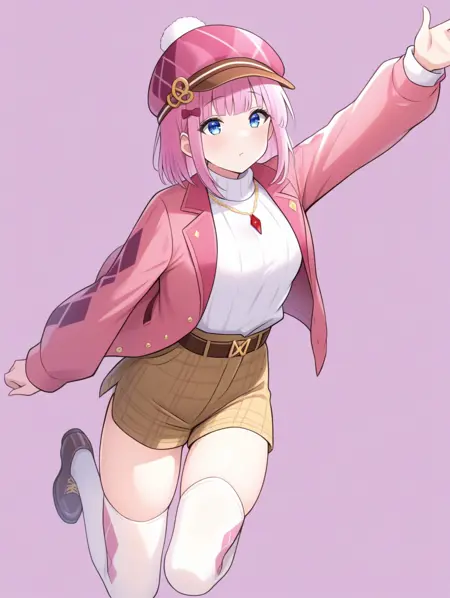 プロンプトの例: amakoi,pink hair,blue eyes,hat,argyle clothes,turtleneck sweater,pink open jacket,shorts,thighhighs,shoes,solo,belt,