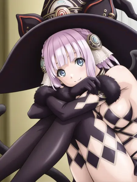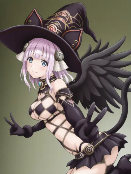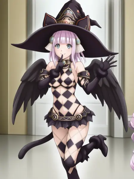 프롬프트 예시: fioremiki,pink hair,hair ornament,blue eyes,witch hat,argyle,elbow gloves,revealing clothes,miniskirt,black wings,cat tail,argyle legwear,