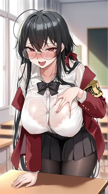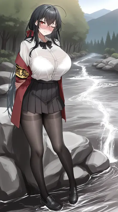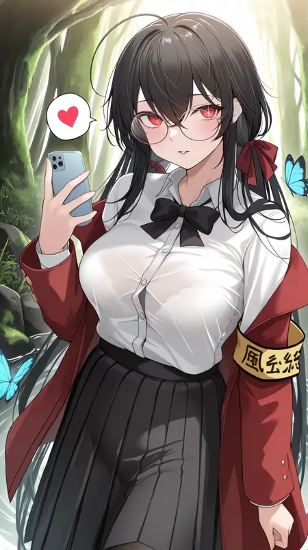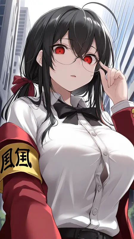 | 학습된 단어 | t4h4zlsts, red eyes, black hair, crossed bangs, long hair, twintails, hair ribbon, red ribbon, ahoge, school uniform, glasses, round eyewear, white shirt, collared shirt, buttons, shirt tucked in, black bowtie, huge breasts, red jacket, open jacket, long sleeves, bra visible through clothes, white bra, yellow armband, black skirt, pleated skirt, miniskirt, black pantyhose, thighband pantyhose, panties under pantyhose, black loafers, 복사됨! |