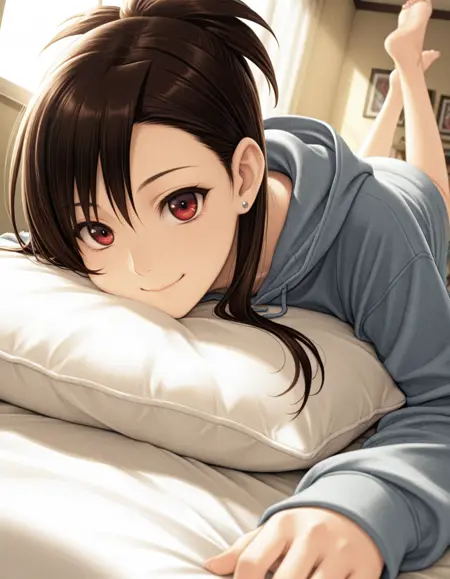 brown hair, red eyes, long hair, sidelocks, long sidelocks, asymmmetrical bangs, ponytail, folded ponytail, earrings, stud earrings