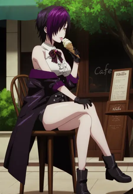 흰색 칼라 셔츠, 어깨 노출, 소매 없음, 검은색 오픈 코트, 중앙 프릴, 와인색 리본넥타이, 빨간 브로치, 검은색 코셋, 회색 단추, 검은색 짧은 쇼츠, 검은 장갑, 검은 발목 부츠