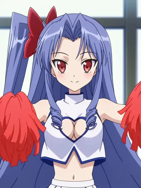 HReika,红眼睛,蓝发,红色发带,长发及地,一侧高高束起,钻头发型,卷发,中等胸部,