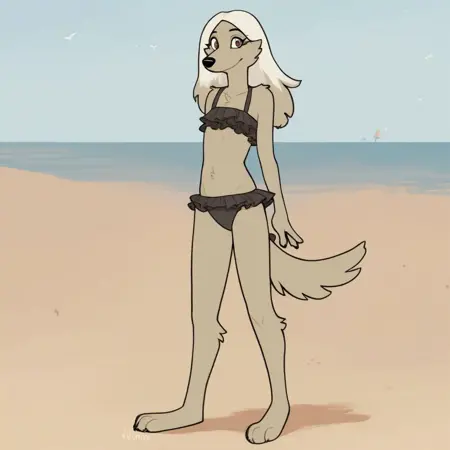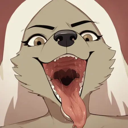 dog girl, afghan hound, grey fur, white hair, two-toned hair, long hair, brown eyes, black nose, dog tail, flat chest,