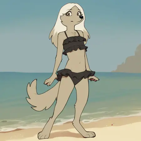 dog girl, afghan hound, grey fur, white hair, two-toned hair, long hair, brown eyes, black nose, dog tail, flat chest,