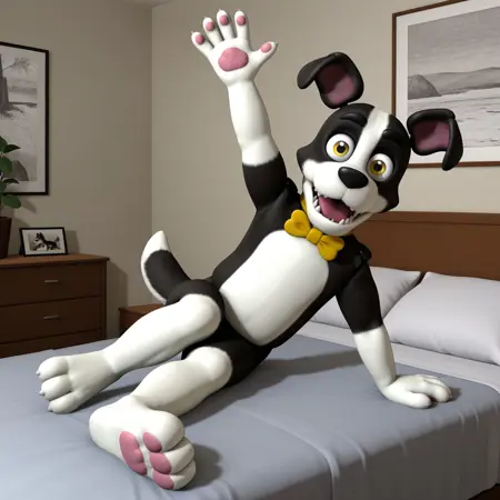 태그: 애니메트로닉, 인간형 로봇, 흑백 신체, 이색 신체, 흰 발, 발바닥, 분홍색 발바닥, 개 귀, 동물 귀, 개, 관절, 흰 무릎, 노란 리본넥타이, 검은 코, 노란 눈, 기계식 개 꼬리, 날카로운 이빨