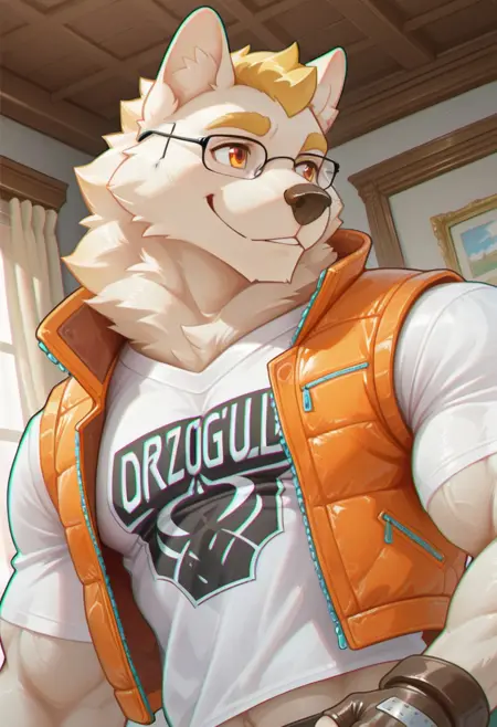 Reinforcement Prompts: "furry, tail, white fur, blond hair, amber eyes, muscular, bara, manly"