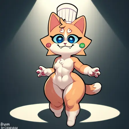 two tone body, orange and white fur, chibi, (solo:1.5), single view, single image, cat girl, cat ears, cat tail, chef hat, hat, cat, {blue eyes|star eyes}, fangs, furry, no humans, animal ears,