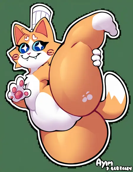 투톤 바디, 주황색과 흰색 털, 치비, (솔로:1.5), 단일 시점, 단일 이미지, 고양이 소녀, 고양이 꼬리, 요리사 모자, 모자, 고양이, {파란 눈|별 모양 눈}, 강아지 이빨, 퓨리, 인간 없음, 동물 귀,