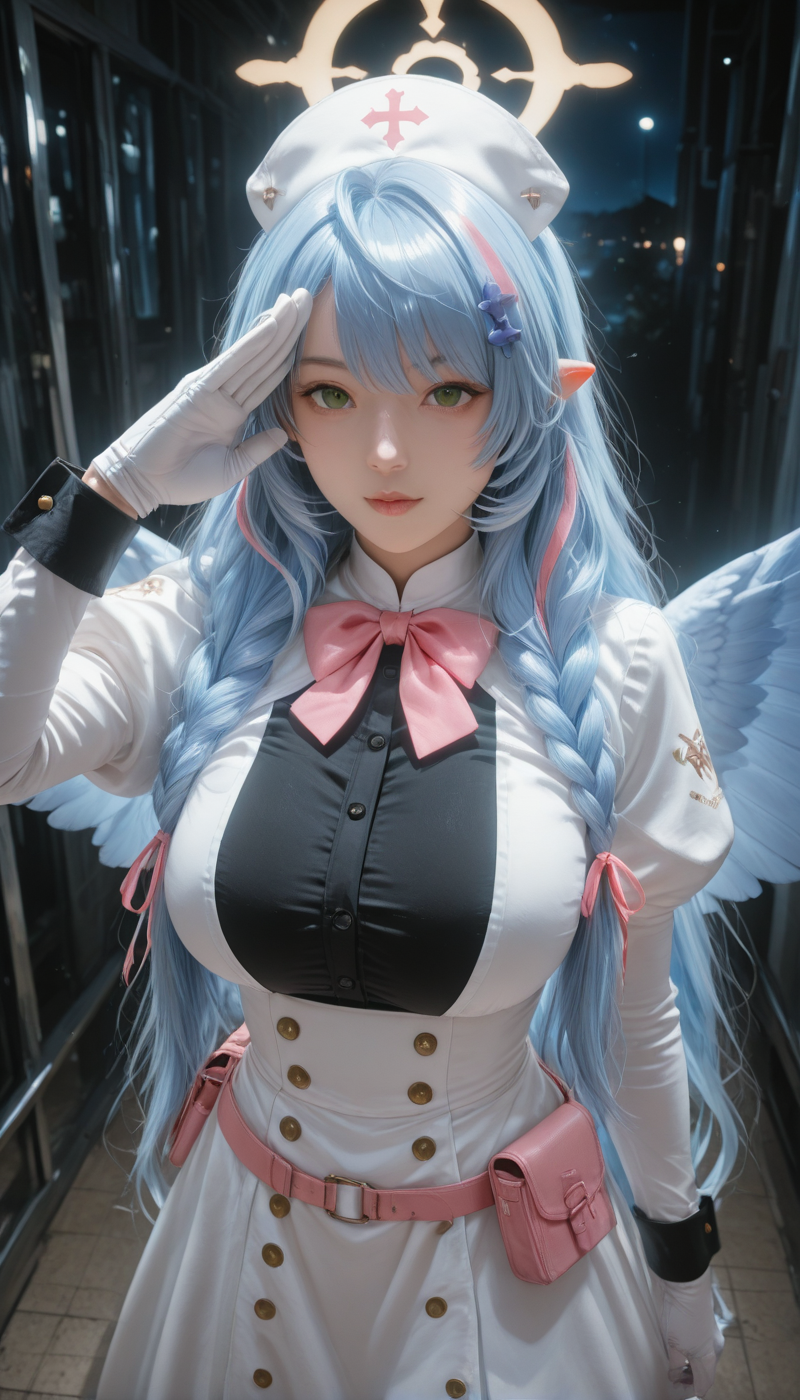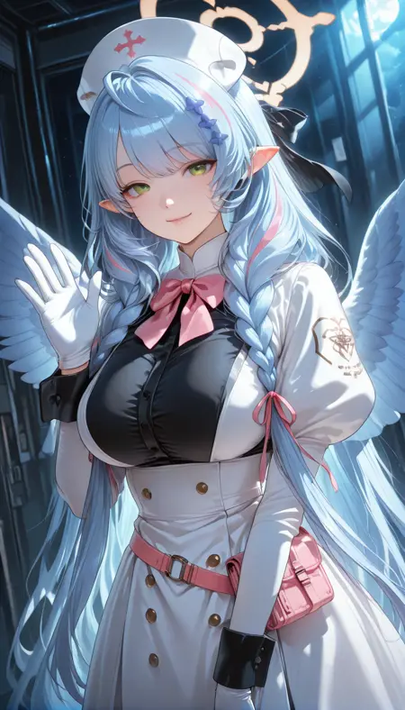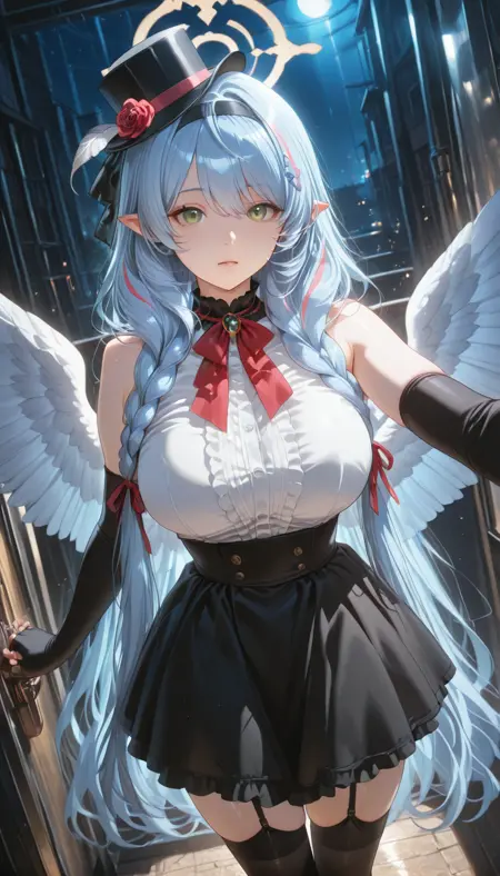 셔츠, 스커트, 장갑, 허벅지까지 긴 양말, 모자, 눈 사이 머리카락, 드러난 어깨, 흰색 셔츠, 꽃, 프릴, 머리띠, 날개, 민소매, 검은색 장갑, 뾰족한 귀, 검은색 허벅지까지 긴 양말, 팔꿈치 장갑, 검은색 스커트, 손가락 없는 장갑, 검은색 신발, 할로, 젯타이 료이키, 검은색 머리장식, 민소매 셔츠, 가터 스트랩, 검은색 머리띠, 깃털, 깃털 날개, 천사 날개, 정장 모자, 흰색 날개, 모자 꽃, 중앙 프릴, 파란색 할로, 흰색 깃털, 검은색 가터 스트랩, 떨어지는 깃털, 모자 깃털, 파란색 할로,