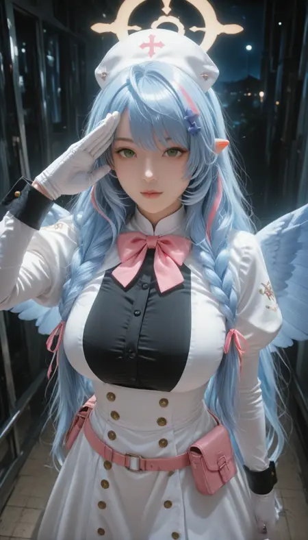 AomoriMine, 큰 가슴, 매우 긴 머리카락, 녹색 눈, 파란색 머리, 땋은 머리, 다색 머리, 뾰족한 귀, 스트라이프 머리, 할로, 쌍 땋은 머리, 깃털 날개, 천사 날개, 낮은 쌍 땋은 머리, 파란색 날개, 머리 장식,