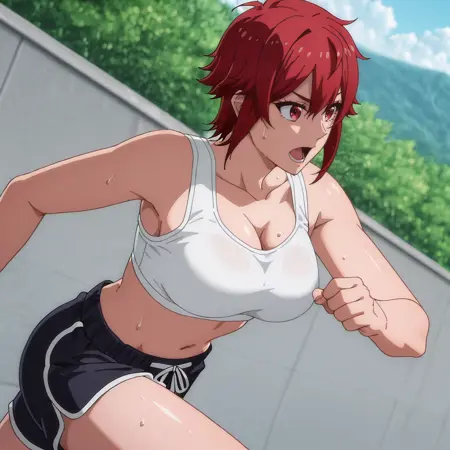 • 带运动服触发词:TomoGymClothes, 红发, 红眼, 红色短裤, 1girl, 白衬衫, 短发, 卷起袖子, 发丝遮眼, 牛仔构图