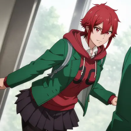 • 带红色夹克触发词:TomoRedJacket, 1girl, 红发, 黑色丝袜, 百褶裙, 校服, 红眼, 夹克, 连帽, 尖牙, 连帽衫, 短发, 发丝遮眼, 衬衫, 牛仔构图