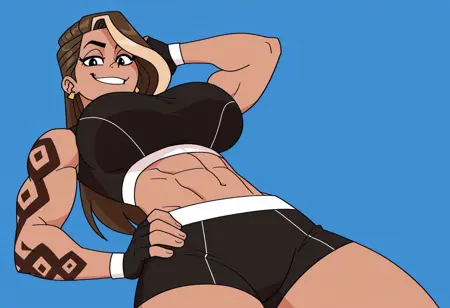 | Trained Words | 1girl, solo, ruby, muscular female, dark-skinned female, brown hair, long hair, streaked hair, black eyes, gold earrings, black sports bra, black shorts, black gloves, fingerless gloves, white trim, cleavage, midriff, one tattoo sleeve, one bare arm,Copied! Orange pajamas, orange button up, orange pants, long sleeves, cleavage,Copied! |