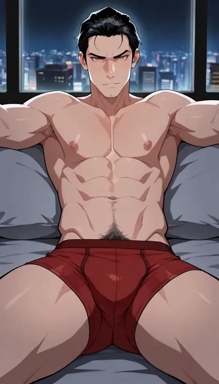geniroh, 1boy, adult male, black hair, short hair, slicked back hair, amber eyes,