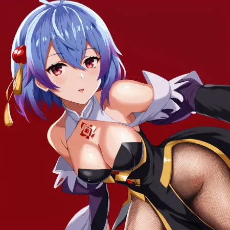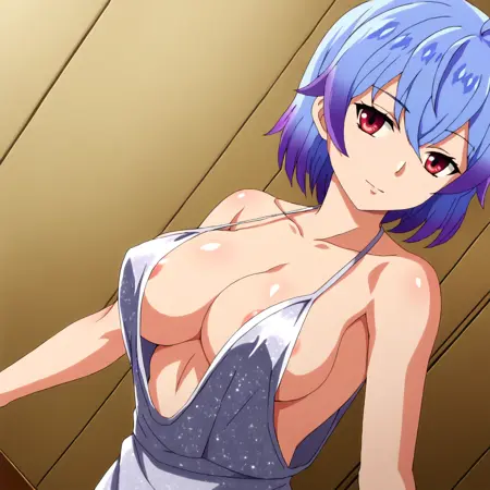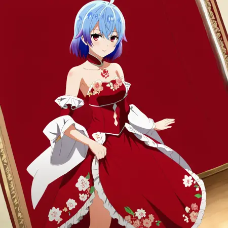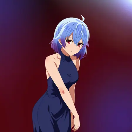 触发词:RutiBanished, 1girl, 蓝发, 红眼, 短发, 护甲, 甲胄连衣裙, 多色发, 紫发, 胸甲, 露肩, 西部镜头