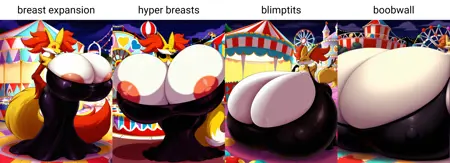 Each concept above can be mixed and matched any way you like. The only thing to keep in mind is that the blimp sizes don't have a space in the word. This was to prevent the AI from just making images of actual blimps XD. Also the ones for breast and butt are Blimptits and Blimpass because those roll off the tongue better. Also since breasts are the biggest focus for most expansion art, those get a fourth size with Boobwall