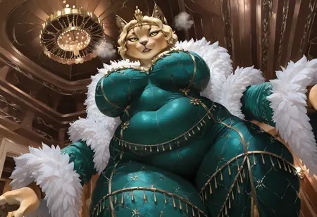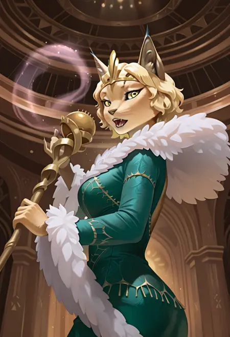 태그: 고양이, 왕관, 금발, 단발, 털이 많은 여자, 털 장식, 동물 귀, 노란 눈, 녹색 드레스, 지팡이 들고 있음 (옵션)