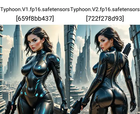 Typhoon V2는 위 모든 특징을 계승하면서, 프롬프트 문구에 대한 반응성도 개선했습니다. V1은 특정 포즈나 방향 힌트에 저항하는 경우가 있었지만, V2는 훨씬 더 순종적입니다. (샘플 비교에는 “화면 뒤로”라는 프롬프트가 포함되어 있으며, V2는 이를 정밀하게 처리합니다.) 중간 거리에서도 눈 렌더링이 눈에 띄게 향상되었습니다. V1은 근접 거리에서 이미 잘 작동했지만, 중간 거리에서는 약간 흐트러졌습니다. V2는 이를 수정하여 넓은 구성에서도 더 선명하고 표현력 있는 눈 디테일을 제공합니다. 재질 렌더링과 환경 분리도 개선되었으나, 전체적인 미학이나 분위기에는 영향을 주지 않았습니다. 여전히 Typhoon이지만… 더 단단해졌습니다.