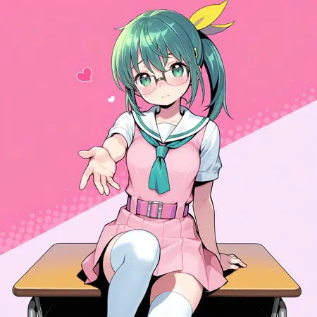 グリーンヘア、ポニーテール、ヘアクリップ、ヘアリボン、イエローリボン、セミリムレス眼鏡、制服、白いタイツ、白いセーラー襟、グリーンのネッカチーフ、ピンクのドレス、白いシャツ、プリーツスカート、ベルトのバックル、ノースリーブドレス、カラーシャツ、ピンクのベルト、プリーツスカート、ピンクのスカート、