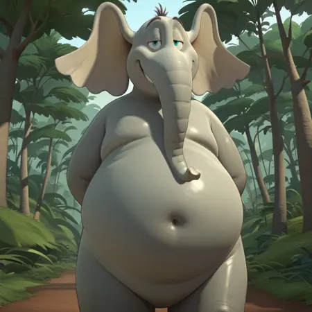 タグ: ホートン・エレファント、象、灰色の皮膚、象の鼻、吻、大きな垂れ耳、頭上の茶色い毛の束、眉、青い目、蹄、象の趾、象の趾の手、小さな尾、尾の毛の束、丸い体、お腹