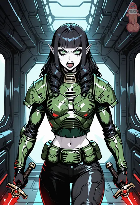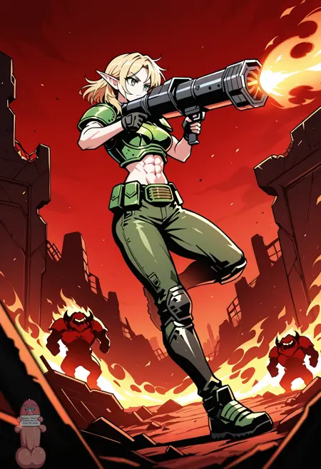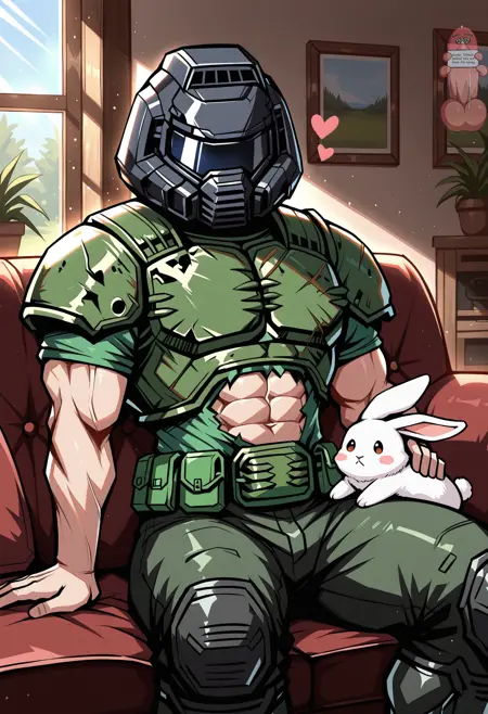 触发词:绿色T恤、绿色盔甲、裤子、doomguy13,